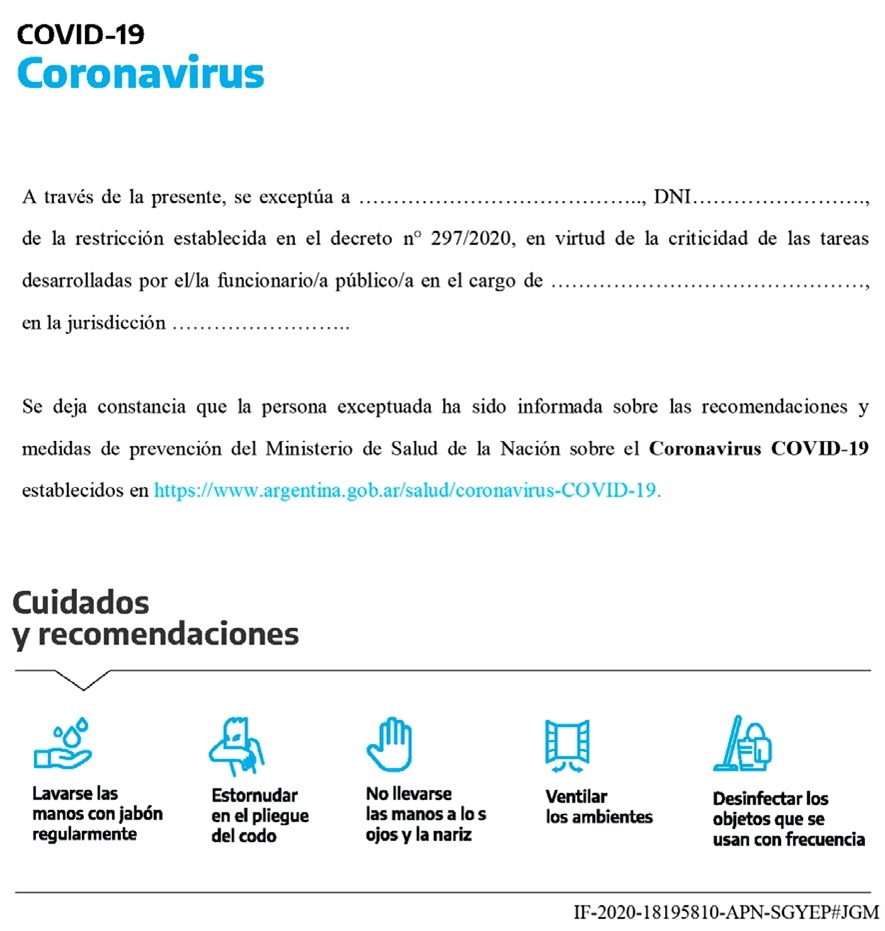 3. Las y los agentes que hubieren sido exceptuados deberán circular con la credencial conforme al Anexo II de la presente, el Documento Nacional de Identidad y copia de la nota correspondiente en soporte papel o digital.
