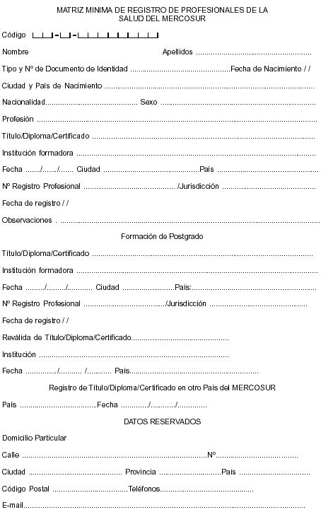 Art. 3 - Los Estados Partes deberán incluir como información mínima para el Registro de los Profesionales de la Salud, los datos indicados en la Matriz Mínima de Registro de Profesionales de la Salud del MERCOSUR que constan en el Anexo I de la presente Resolución.