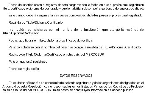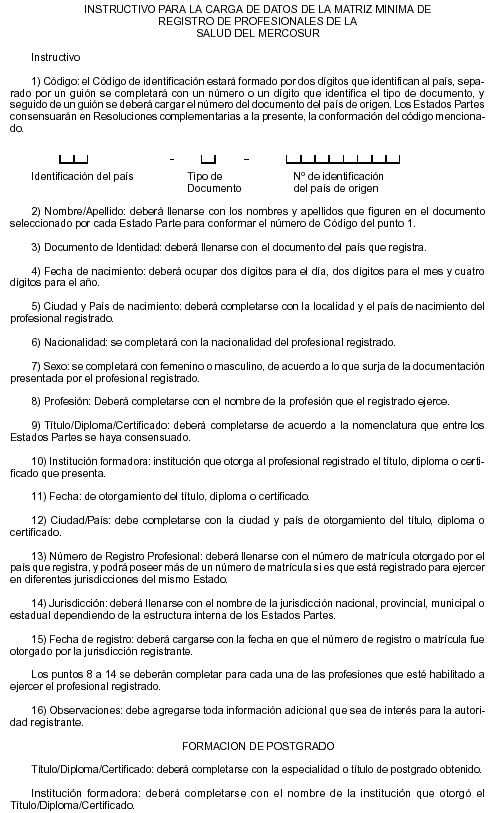 Art. 2 - Aprobar el "Instructivo para la carga de datos que los órganos competentes de los Estados Partes deberán observar al completar la información requerida por la Matriz Mínima de Registro de Profesionales de Salud del MERCOSUR", que consta como Anexo II de la presente Resolución].